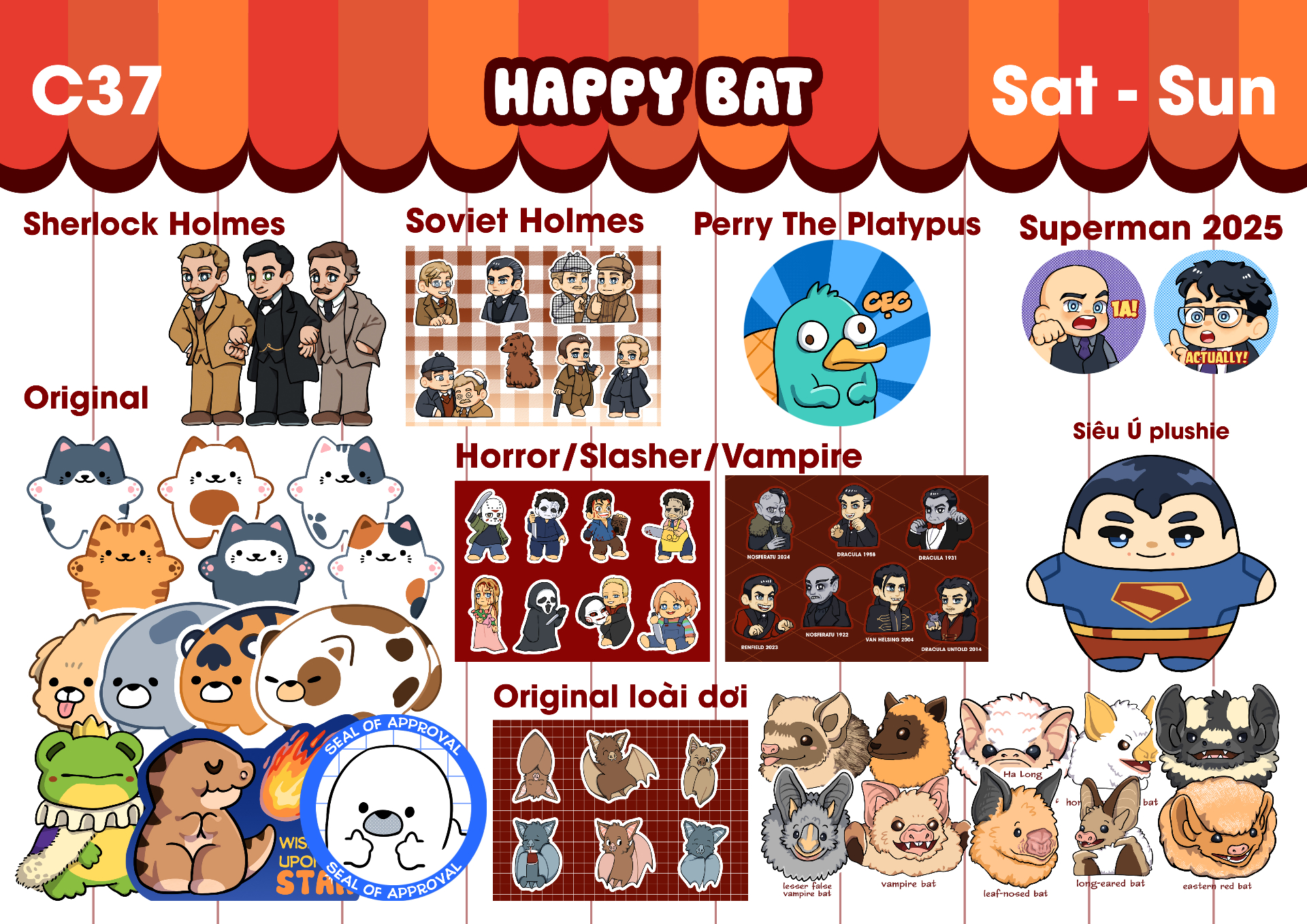 Chào mn, tui aka Happy Bat xin chào hàng. Dưới đây là sample của Happy Bat trong kỳ Color Fiesta: Bản Sắc __________ ORIGINAL: _ Loài dơi _ Thú mập _ Handmade len _ Thú bông tui làm FANDOM: _ Sherlock Holmes nhiều phiên bản _ Superman 2025 _ Slipknot _ Ghost band _ Horror/Slasher _ Lão bá tước Dracula/Orlok _ COD Ghost với Konig FREEBIES: _ Metal band sticker _ OC trading card __________ HAPPY BAT - GIAN C37 #cofi #artist #cofiss16